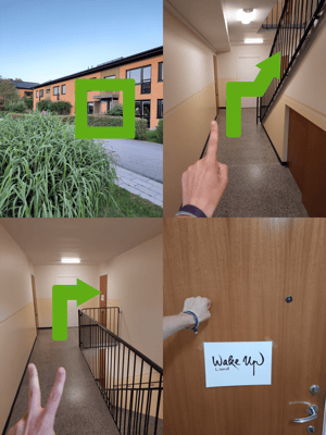 Once you enter take the stair to the second floor and it is the door with the Wake Up sign on it.